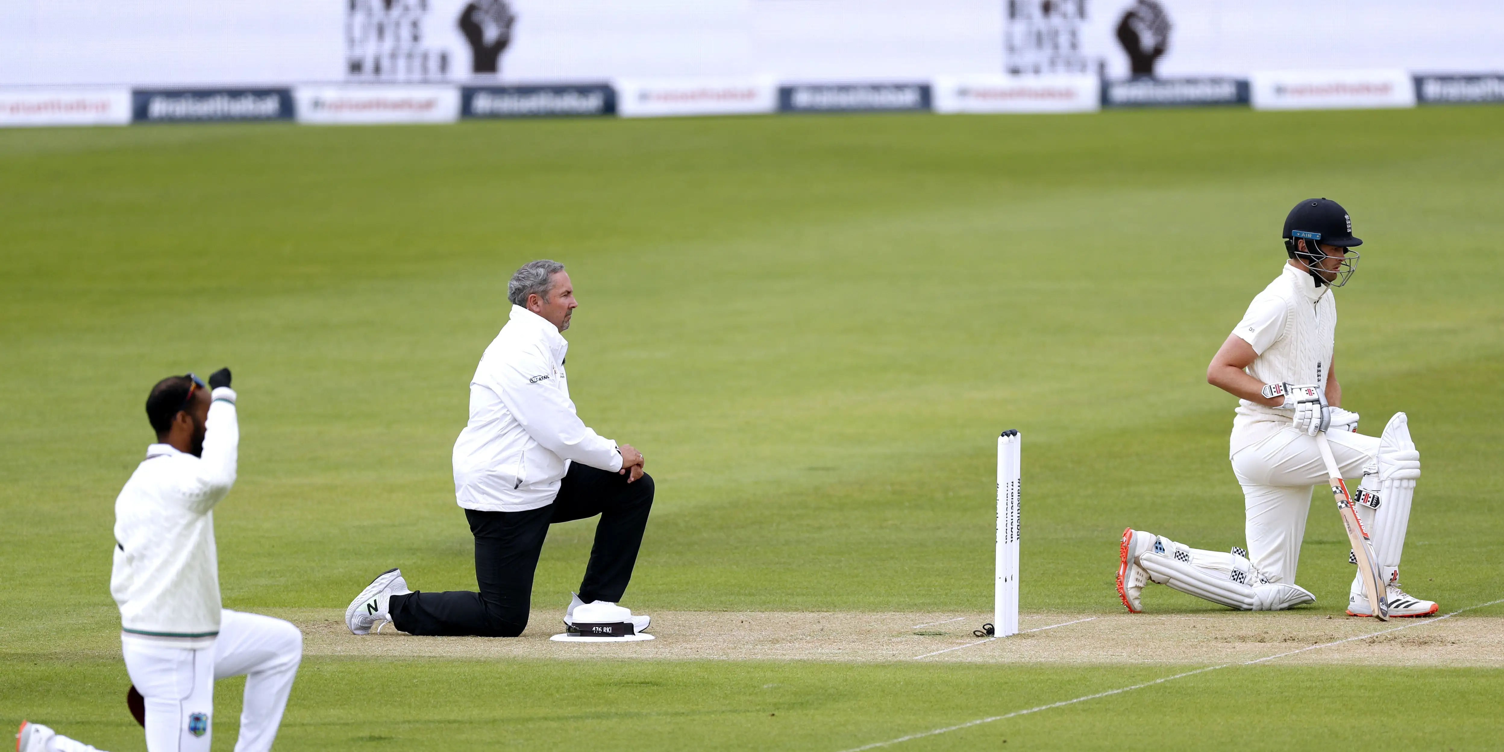 Just before the first ball was delivered, and with batsmen, umpires and fielders in position, the sides collectively took a knee – with all members of the West Indian contingent wearing a single black glove and raising their right fist.