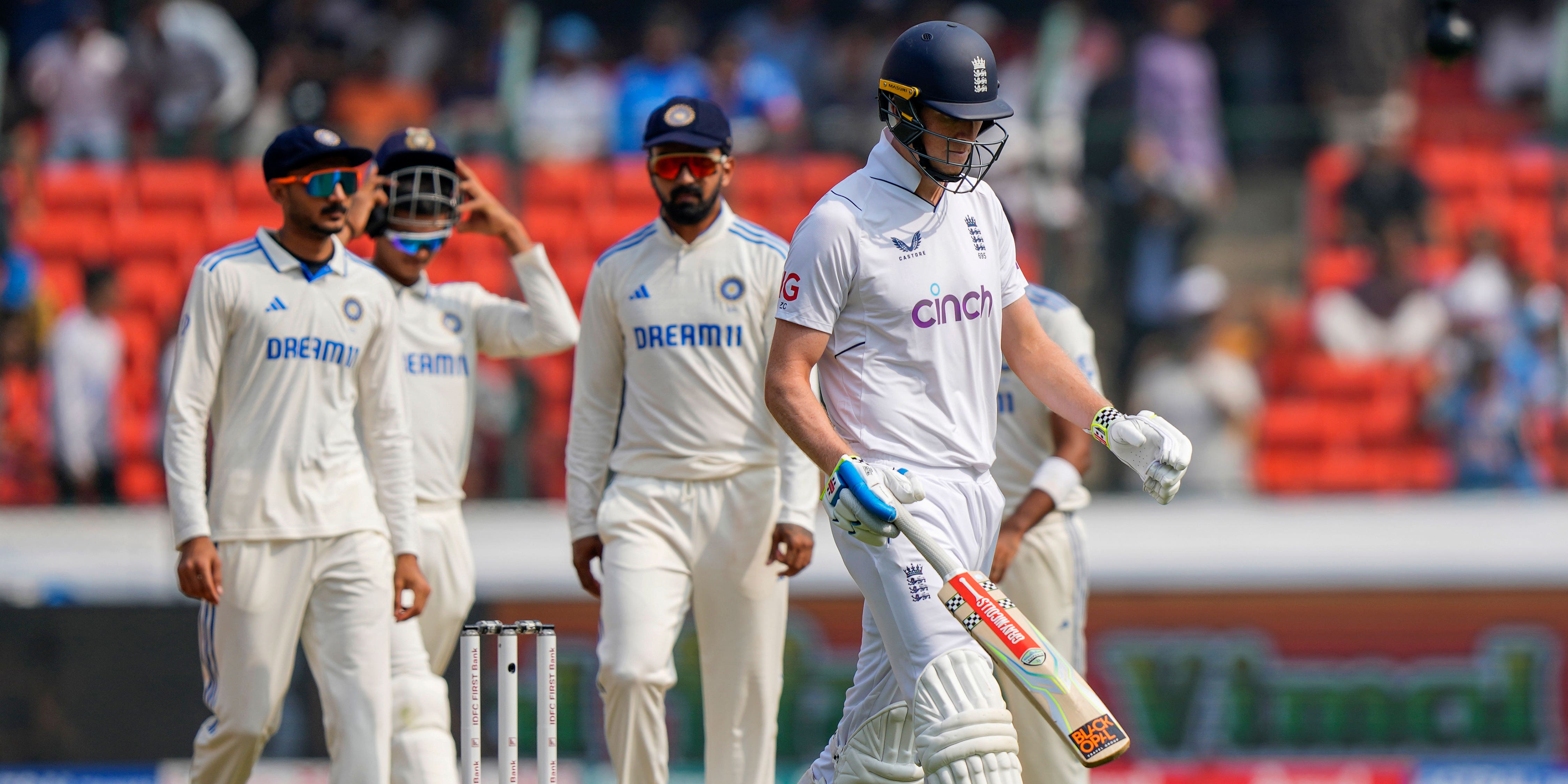 Crawley sent a couple of reverse sweeps to the boundary boards before trying something even more expansive, moving his feet to the pitch and lifting Patel for six down the ground. It was a bold beginning but it ended all too quickly, Ashwin clipping the outside edge with a precise delivery that nestled in Rohit Sharma’s hands.