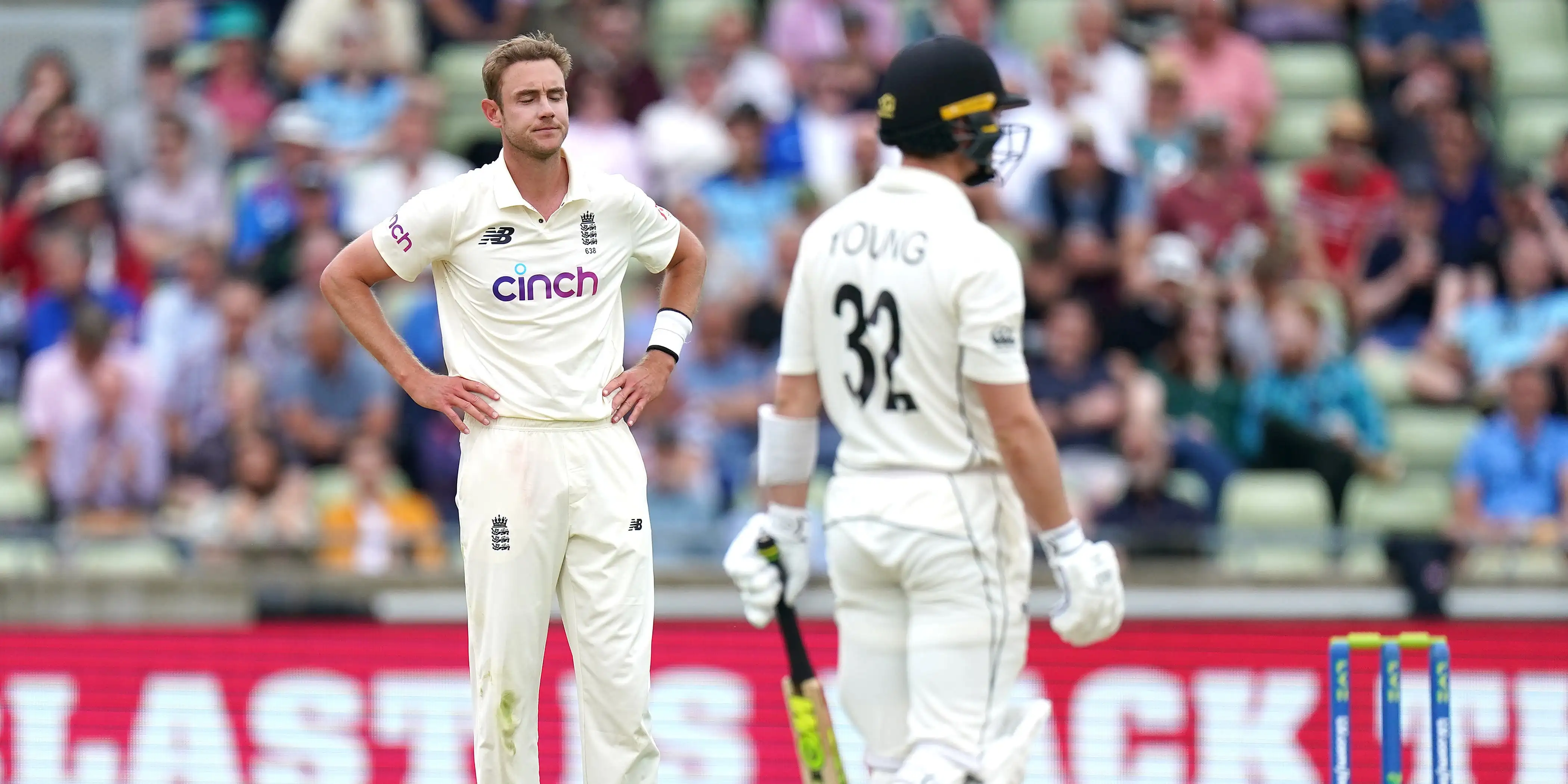 Broad had already pinned Tom Latham lbw when he found Devon Conway’s edge and saw Zak Crawley tumble forward to take a low catch at third slip.