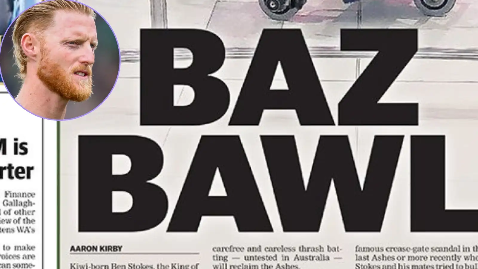 The headline for the genuinely front-page news that Stokes had ‘sauntered’ through the airport? BAZ BAWL.