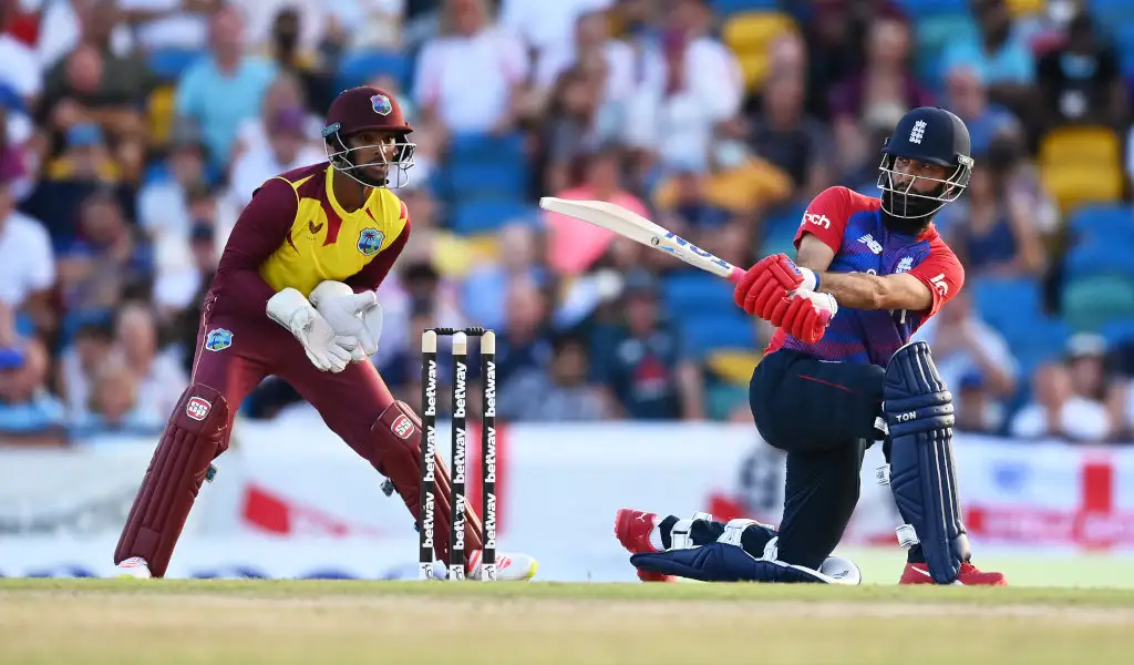 The Windies raced to 56 without loss from the powerplay but Moeen and Adil Rashid were able to put the squeeze on the hosts, who slipped from 64 for none to 78 for three then 97 for four under lights at Bridgetown.