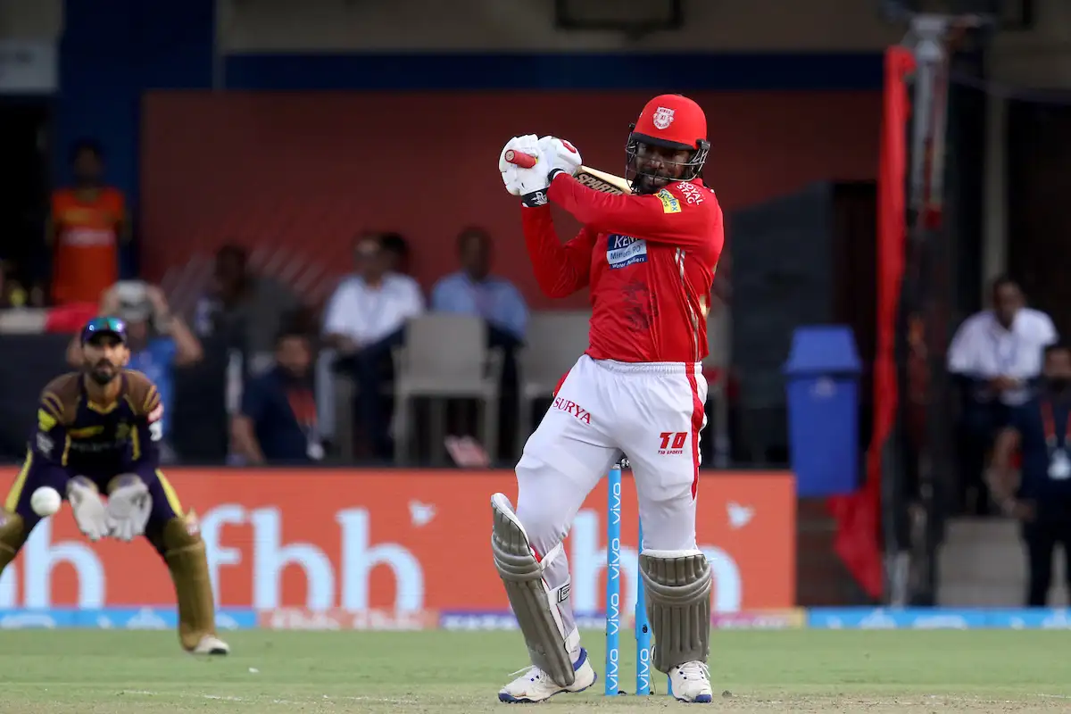 Chris Gayle of the Kings XI Punjab plays a shot during match forty four of the Vivo Indian Premier League 2018 (IPL 2018) between the Kings XI Punjab and the Kolkata Knight Riders held at the Holkar Cricket Stadium, Indore on the 12th May 2018.