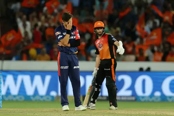 Trent Boult of the Delhi Daredevils reacts after bowling a wide ball during match thirty six of the Vivo Indian Premier League 2018 (IPL 2018) between the Sunrisers Hyderabad and the Delhi Daredevils held at the Rajiv Gandhi International Cricket Stadium in Hyderabad on the 5th May 2018.